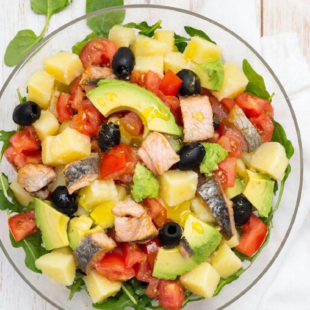 4. В миске смешайте все ингредиенты, добавьте оливковое масло и лимонный сок. Посолите и поперчите.