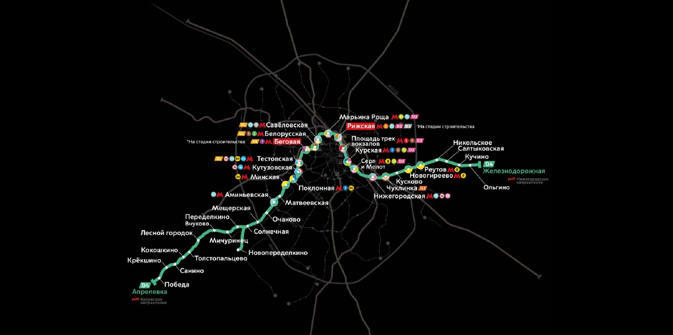 Четвертый Московский центральный диаметр связал Киевское и Горьковское направления железной дороги. Маршрут проходит от Апрелевки до Железнодорожного и включает 39 остановок. Его протяженность составляет 85 километров, на схеме он обозначен зелёно-бирюзовым цветом. По количеству пересадок МЦД-4 стал рекордсменом: 18 станций обеспечивают 44 варианта перехода на метро, МЦК и другие диаметры, что делает линию одной из самых сложных по инфраструктуре.