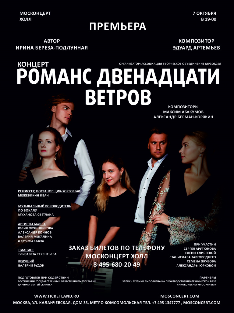 В четверг, 7 октября, в столичном «Москонцерт холле» состоится премьера уникального концерта «Романс Двенадцати ветров». Он станет первой часть музыкального проекта «Романсиада Двенадцати ветров» выдающегося российского композитора Эдуарда Артемьева. Его создателями выступили поэтесса Ирина Береза-Подлунная и три композитора: сам Эдуард Артемьев, Максим Абакумов и Александр Берман. Также в проекте участвует Большой симфонический оркестр под управлением Сергея Скрипки.