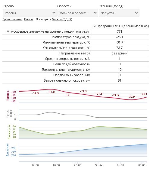 Там же, в Черустях, была зарегистрирована и самая низкая температурная отметка за прошлую ночь. Приборы показали -31,7°С. А вот в столице минувшая ночь оказалась на несколько градусов теплее. Метеостанция на ВДНХ зафиксировала -24,5°С.
