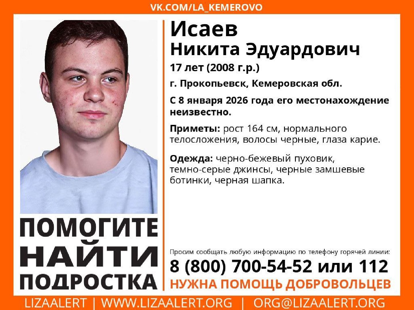 Как сообщает издание «Сiбдепо», 17-летний Никита Исаев из Прокопьевска перестал выходить на связь 8 января 2026 года. Добровольческий поисковый отряд «ЛизаАлерт» 9 января распространил информацию о его исчезновении. Волонтёры и родственники просят общественность помочь в поисках.