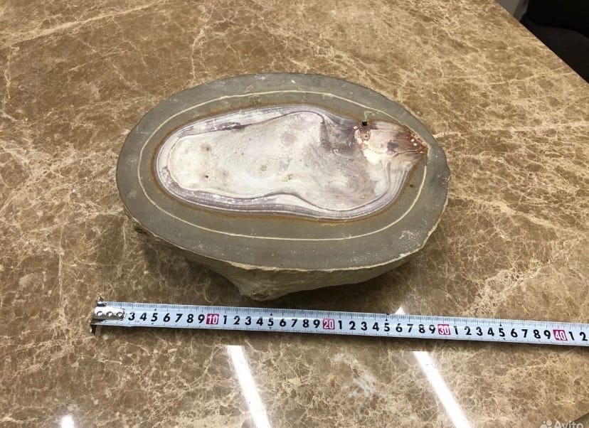 «Идеальный раскол наглядно показывает две практически ровные половинки, выпуклая сердцевина отчетливо идентична зародышу животного. Обнаружено на известковом карьере, глубина залегания 50 метров», — сообщается в объявлении.