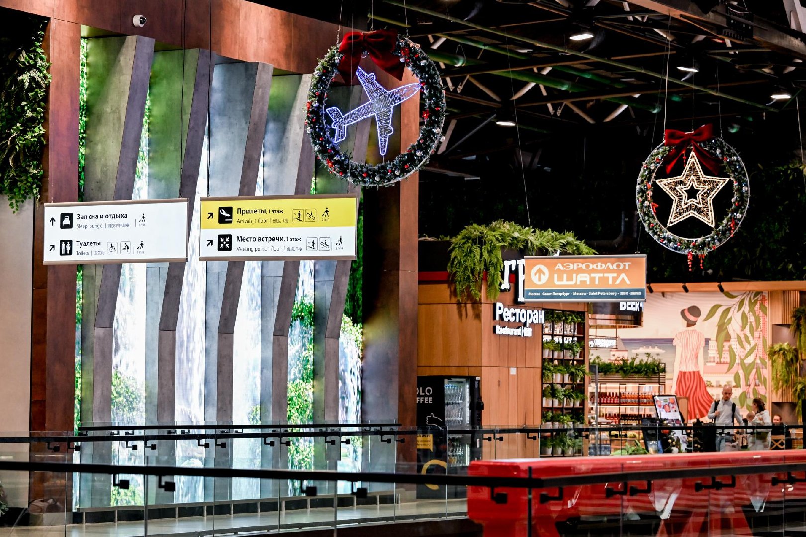 К Новому году и Рождеству Шереметьево оформил пассажирские зоны световыми инсталляциями, ёлками и декоративными конструкциями, а еще присоединился к всероссийской акции «Почта Деда Мороза».