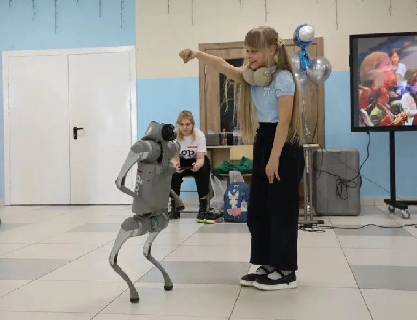 Всеобщее внимание ещё до начала лекций приковывал к себе необычный встречающий. У входа гостей приветствовала собака-робот.