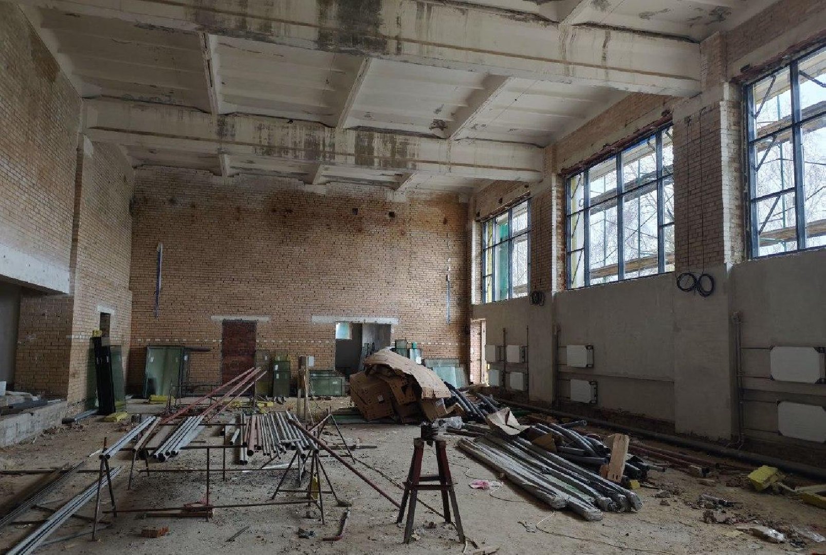 На объекте работают 43 человека и задействованы 2 единицы техники. Здесь завершили демонтажные работы, ведут общестроительные и отделочные, ремонтируют фасад и кровлю, а еще монтируют инженерные коммуникации.