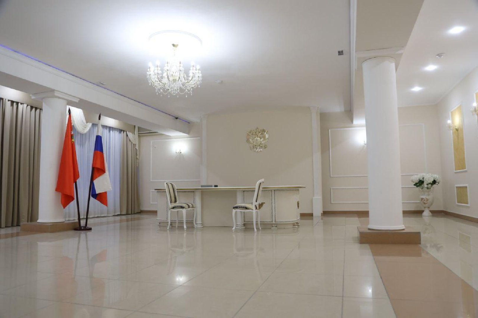 Торжественный зал для бракосочетания после ремонта значительно обновлён. Там обновили отделку стен и потолка, освещение стало более современным и уютным. В комнате невесты обновлены интерьер и мебель, установлены новые системы освещения и вентиляции.