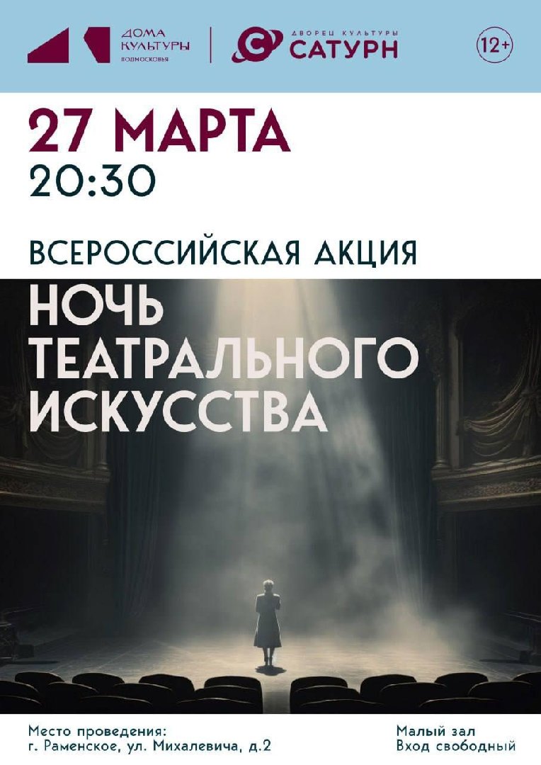 Жители Раменского станут участниками всероссийской акции, приуроченной ко Всемирному дню театра и юбилею Союза театральных деятелей России. «Ночь театрального искусства» состоится в Малом зале ДК «Сатурн», сообщили в пресс-службе администрации муниципального округа.
