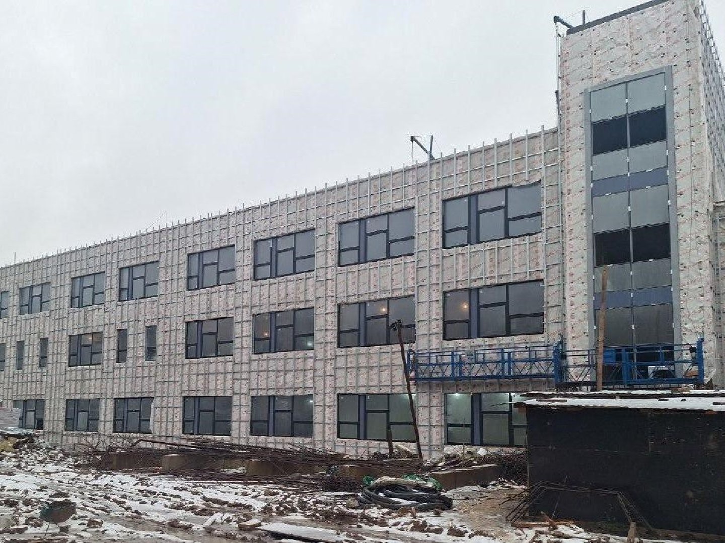 На объекте кладут перегородки на третьем этаже, монтируют вентиляционные короба, ведут электромонтаж и прокладывают сантехнику. Рабочие делают стяжку пола, оформляют фасад, устанавливают окна и витражи.