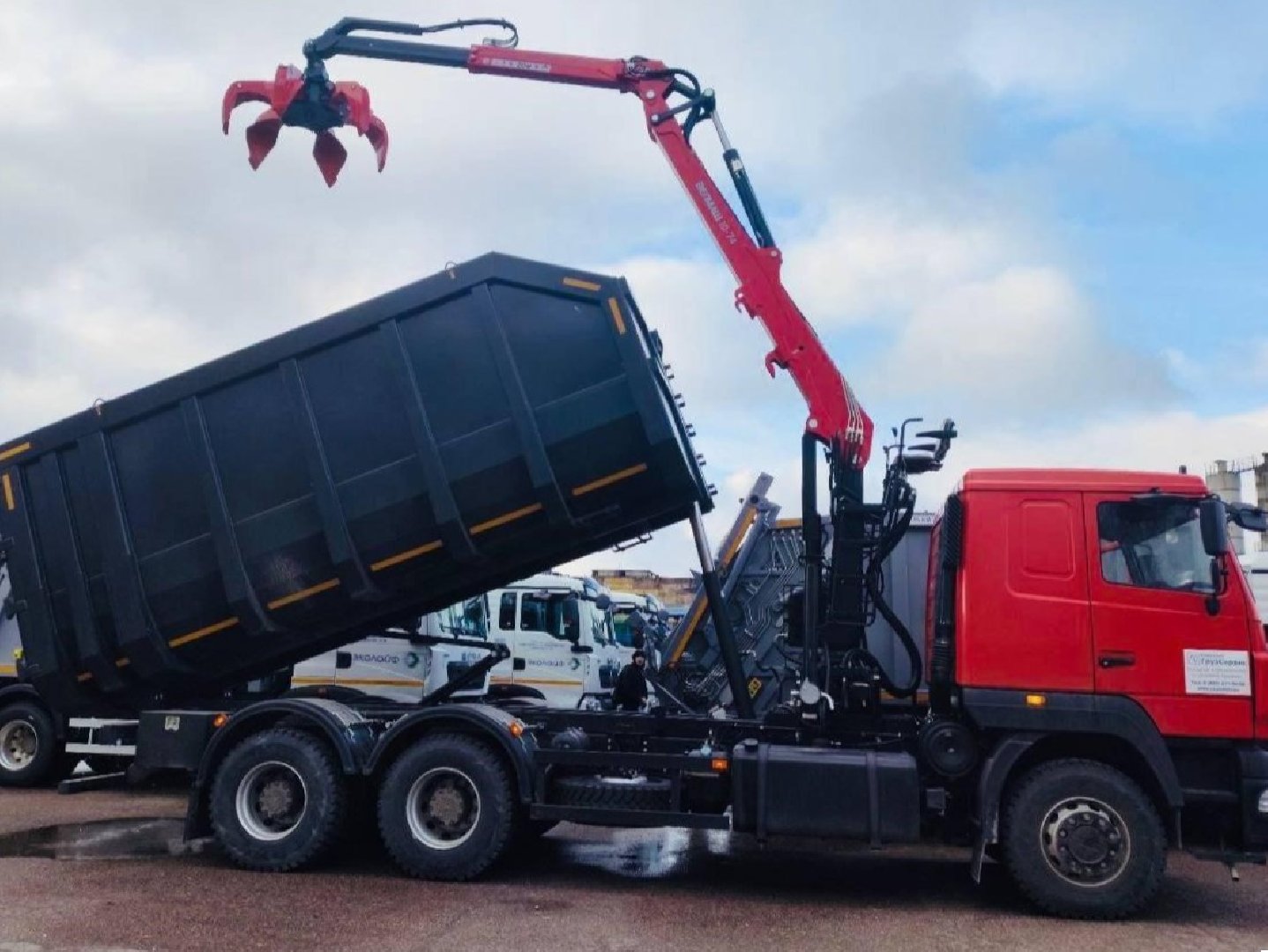 У новых ломовозов есть гидроманипуляторы с грейферными захватами. Такая техника помогает быстро загружать металлический лом, строительные отходы и крупногабаритный мусор. Кузов каждой машины рассчитан на 30 м³ и могут перевозить до двух тонн груза.