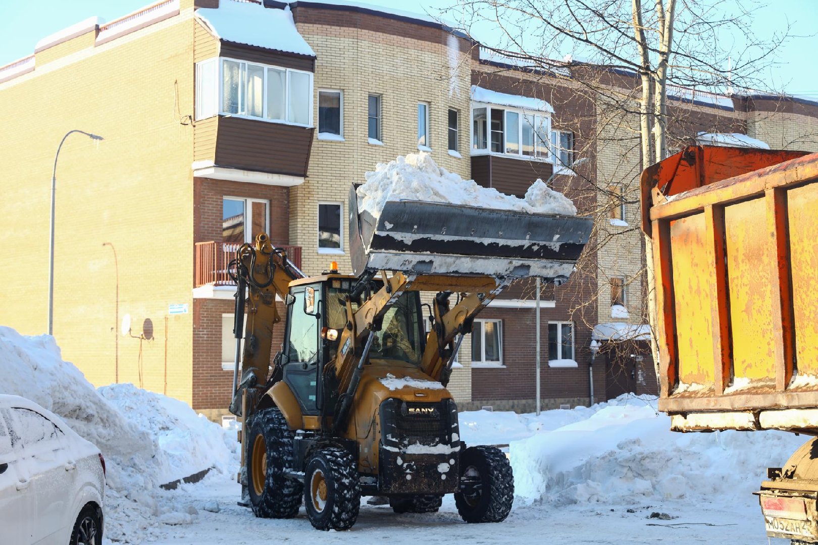 Дворники убирают снег рядом с припаркованными машинами и в местах, где не проезжает техника. Задача дорожников – очистить подходы к контейнерным площадкам.