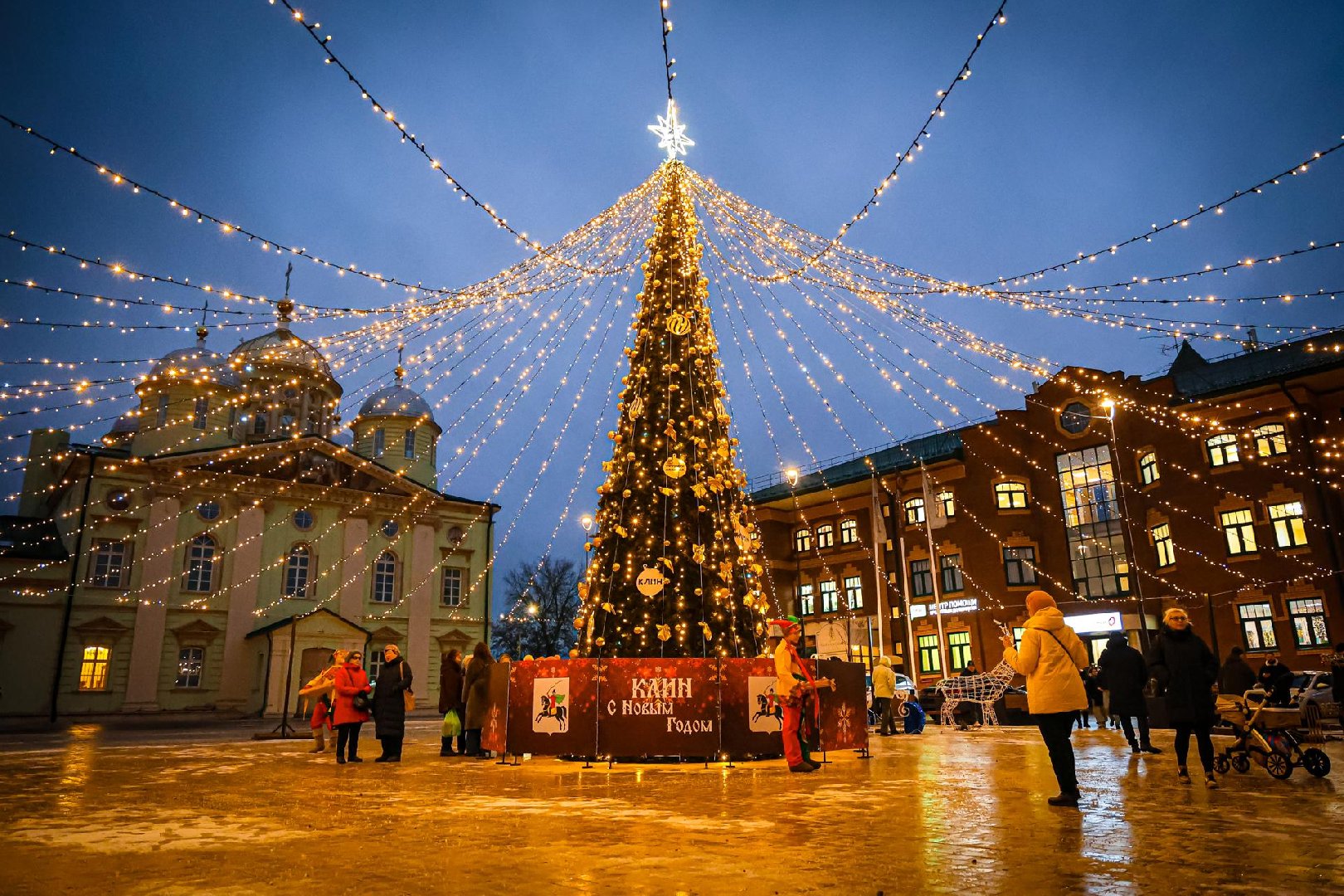 К Новому году площадь украсили праздничной иллюминацией и арт-объектами. Здесь впервые за много лет установили девятиметровую ёлку с гирляндами, золотыми шарами, бантами и эффектом «звёздного неба». Рядом установили новогодние инсталляции — рояль и олень с санями. Пространство уже стало популярным местом для красивых новогодних фотографий.