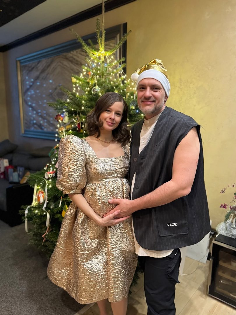 На фото актёр нежно обнимает супругу, положив руку ей на живот, а сама Шпица позирует в золотистом платье. Артистка уточнила, что публикует кадр в Рождество, хотя он делался в новогоднюю ночь.