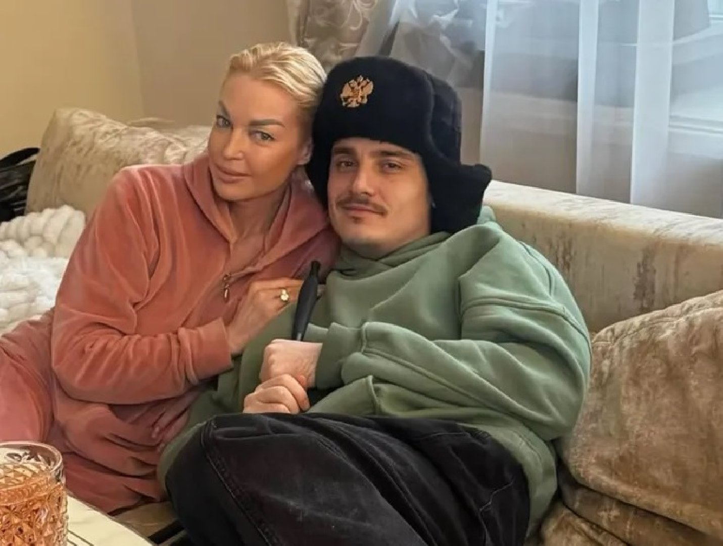 На снимке Волочкова и её спутник сидят на диване. Балерина подписала фотографию: «С Новым годом! My love Марчел!».