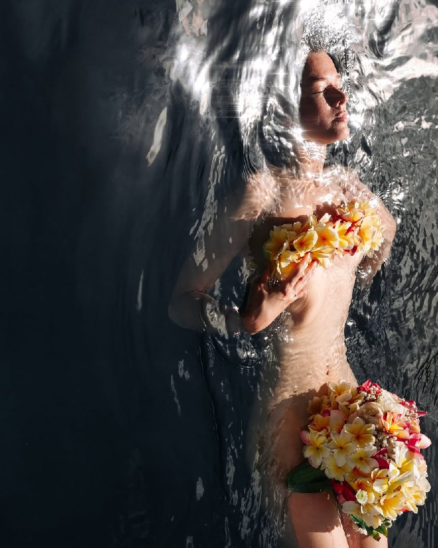 Свои слова фотограф дополнил откровенными снимками Катерины, сделанными им самим. На одном кадре актриса позирует в воде, прикрываясь цветами, на другом — сидит у края бассейна, скрываясь за растениями и влажной тканью.