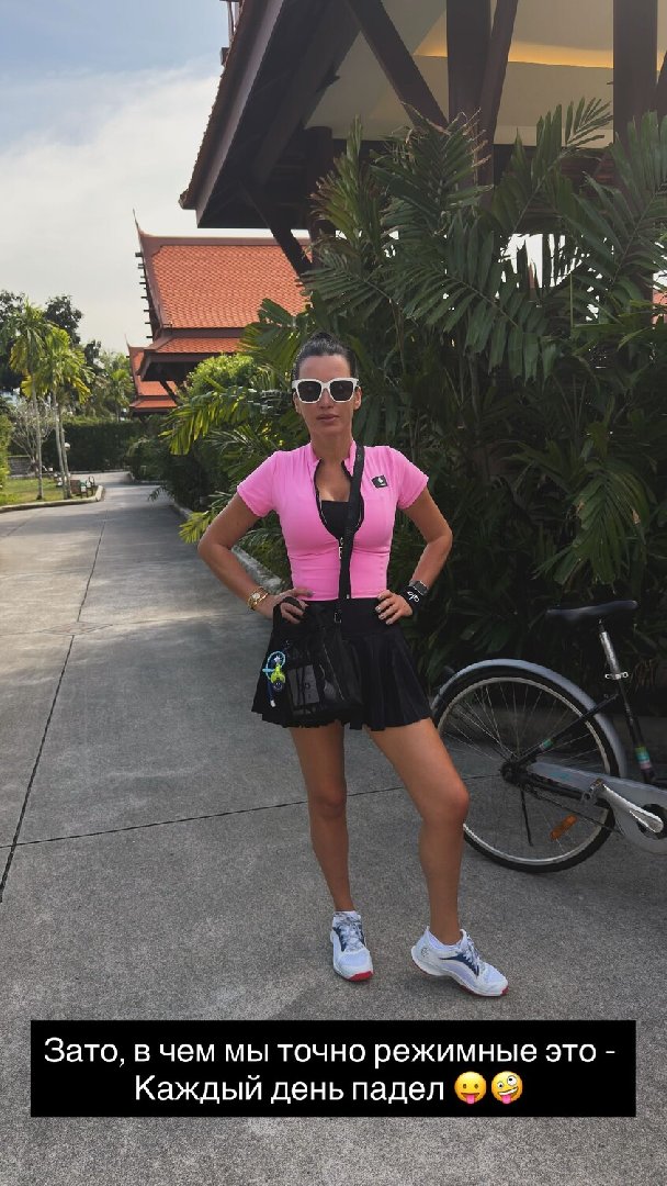 Бородина отправилась в эту страну на новогодние праздники вместе с семьёй. На опубликованных кадрах телеведущая позирует в спортивном луке: она сочетает чёрную теннисную юбку, топ и яркий розовый жилет. Причёску Ксения оформила в высокий пучок, макияж выполнила в естественной, лёгкой манере.