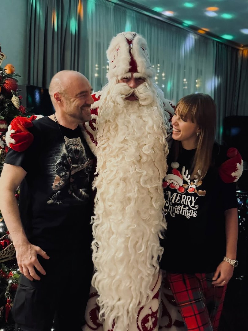 Для вечера Полина выбрала расслабленный образ: черную футболку с надписью «Счастливого Рождества», красные клетчатые брюки и меховые тапочки. Роман сделал ставку на лаконичный total black.