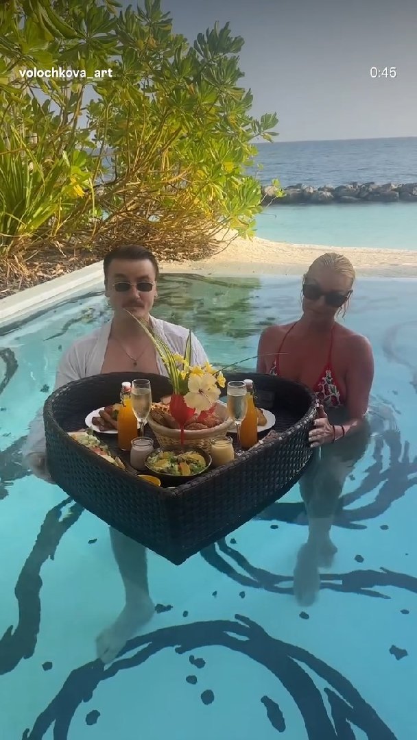 В новых кадрах Волочкова запечатлела утреннюю трапезу в открытом бассейне. На плавающем подносе, помимо цветов и еды, находятся два бокала с шампанским. Ранее артистка рассказывала, что начинает день на Мальдивах именно с этого напитка.