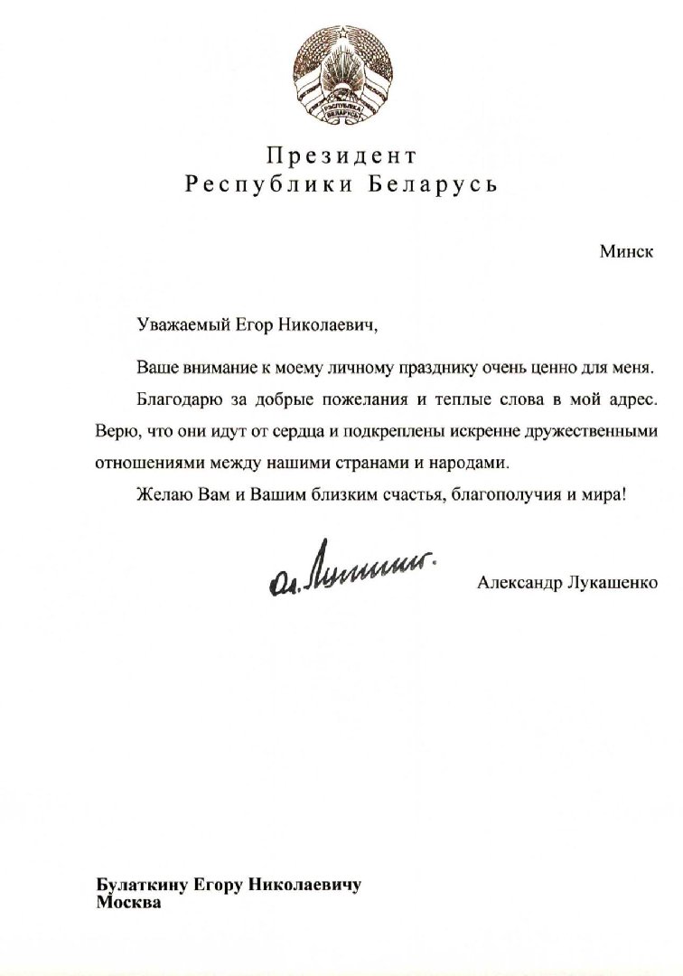 Певец Егор Крид (настоящее имя — Егор Булаткин) опубликовал в своём Telegram-канале благодарственное письмо от президента Белоруссии Александра Лукашенко.