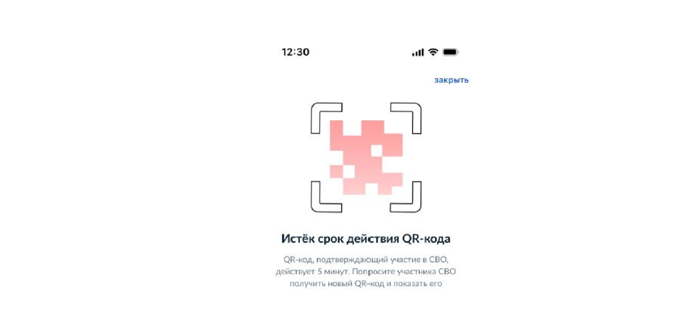 Если предъявлен QR-код с идентификатором, отсутствующим в сервисе, или срок действия кода истёк, сервис покажет соответствующие сообщения.