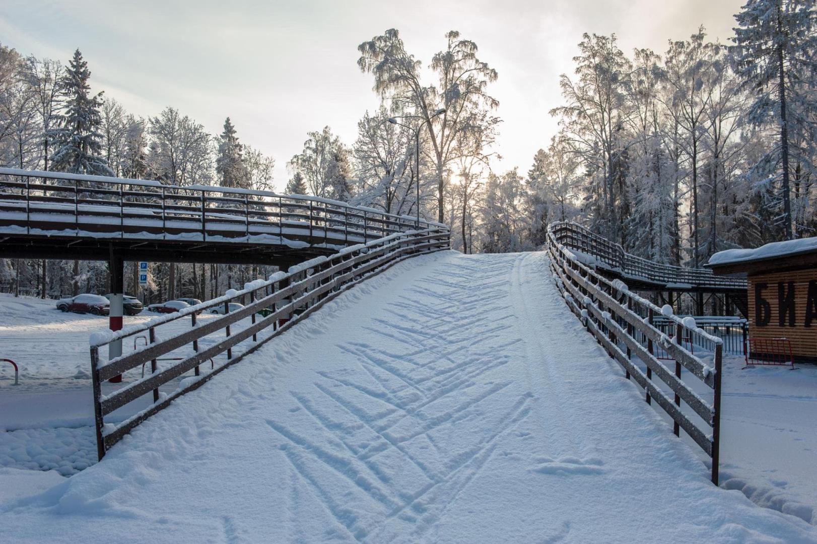 Начинающие спортсмены могут выбрать для катания на лыжах Мещерский лесопарк в Мытищах. Трасса проходит по почти плоскому рельефу без крутых подъемов и спусков по всей территории парка, а длина маршрутов варьируется от 1 до 5 километров. Есть освещение.